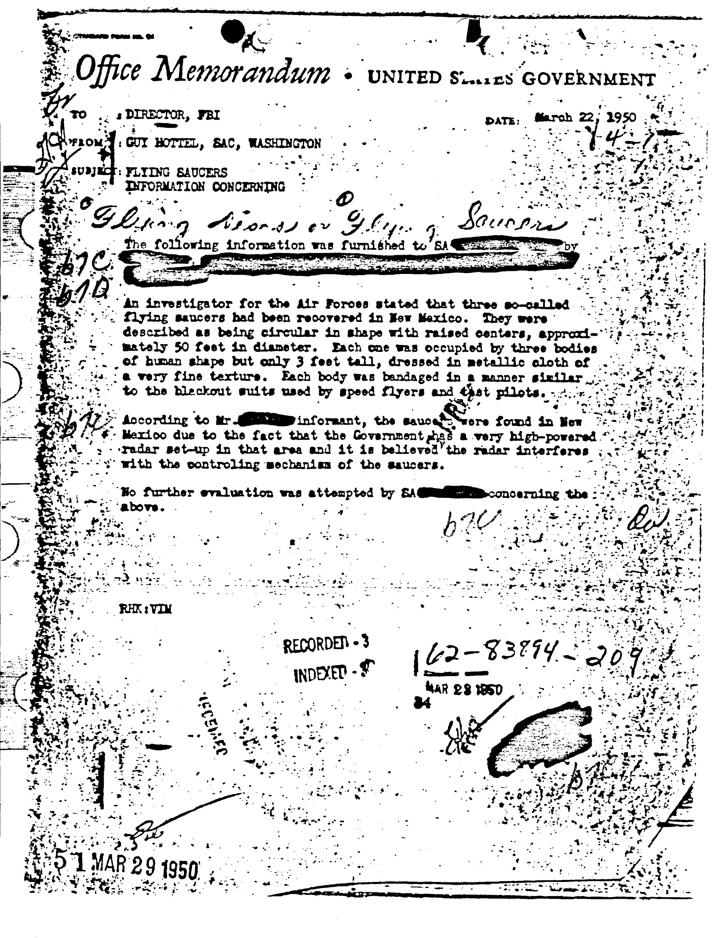 Ufo e alieni esistono, se non altro nei documenti ufficiali dell’FBI. Ciò che appassionati di fantascienza, dischi volanti ed extraterrestri speravano da decenni si sta avverando: la rete si sta vorticosamente colmando della notizia relativa al documento redatto dall’agente Guy Hottel, il vero Fox Mulder degli X-Files, che ha indagato non soltanto sui dischi volanti ma pure sui fenomeni inspiegabili (mutilazioni animali, ESP e facoltà paranormali). Non mancano ovviamente le opinioni scettiche, tra gli stessi ufologi: sarebbe null’altro che una testimonianza raccolta dall’agente Hottel, incaricato di simili indagini.