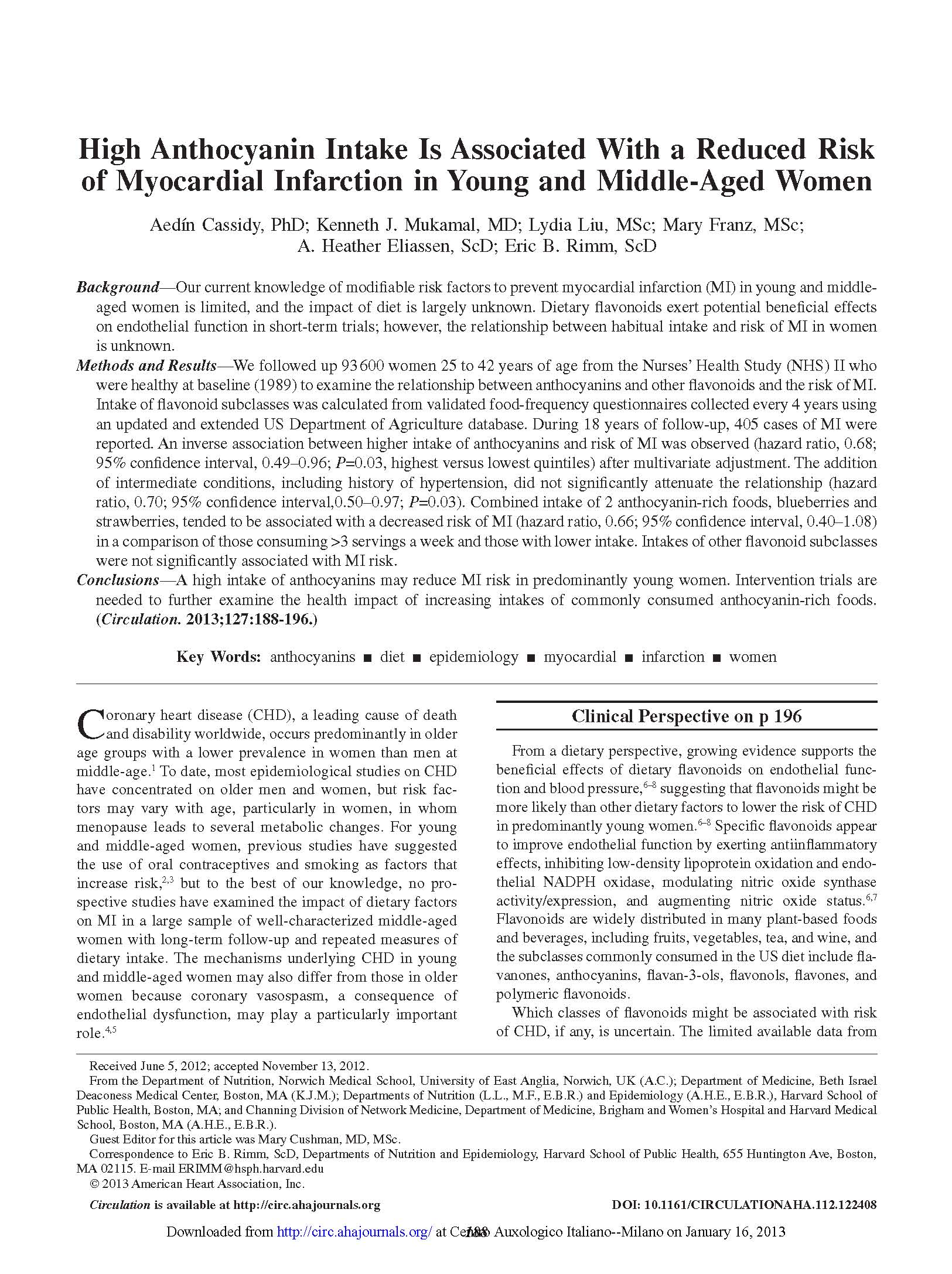 Riferimenti biblio: Cassidy A, Mukamal KJ, Liu L, Franz M, Eliassen AH, Rimm EB., High anthocyanin intake is associated with a reduced risk of myocardial infarction in young and middle-aged women, Circulation. 2013 Jan 15;127(2):188-96