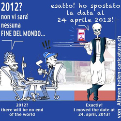 * Autunno 2012: non avevamo dubbi. Non solo gli “apocalittici” sono una ben precisa categoria umana, psicologica e comportamentale, ma addirittura vi sono, un po’ in tutto il mondo, persone che operativamente si preparano all’apocalisse. National Geographic Channel ne ha fatto una trasmissione. Come riferisce Alessandra Comazzi (La Stampa 30/9/12) “Apocalittici è la serie di maggior successo della rete, altro che elefanti e serpenti”. Quindi, fine del mondo o meno tra poco più di due mesi, come abbiamo scritto più volte, l’apocalisse è un fiorente business. E, perché no, vedendo come trascorrono il loro tempo gli “Apocalittici”, anche un hobby. Impegnativo, costoso, un po’ folle, come tutti gli hobby sostenuti dalla’ossessività. Poi c’è l’artista, vignettista e caricaturista svizzera Helen von Allmen che reinterpreta graficamente lo “spostamento” di apocalisse (l’unica previsione che si realizzerà veramente il 21 dicembre 2012).